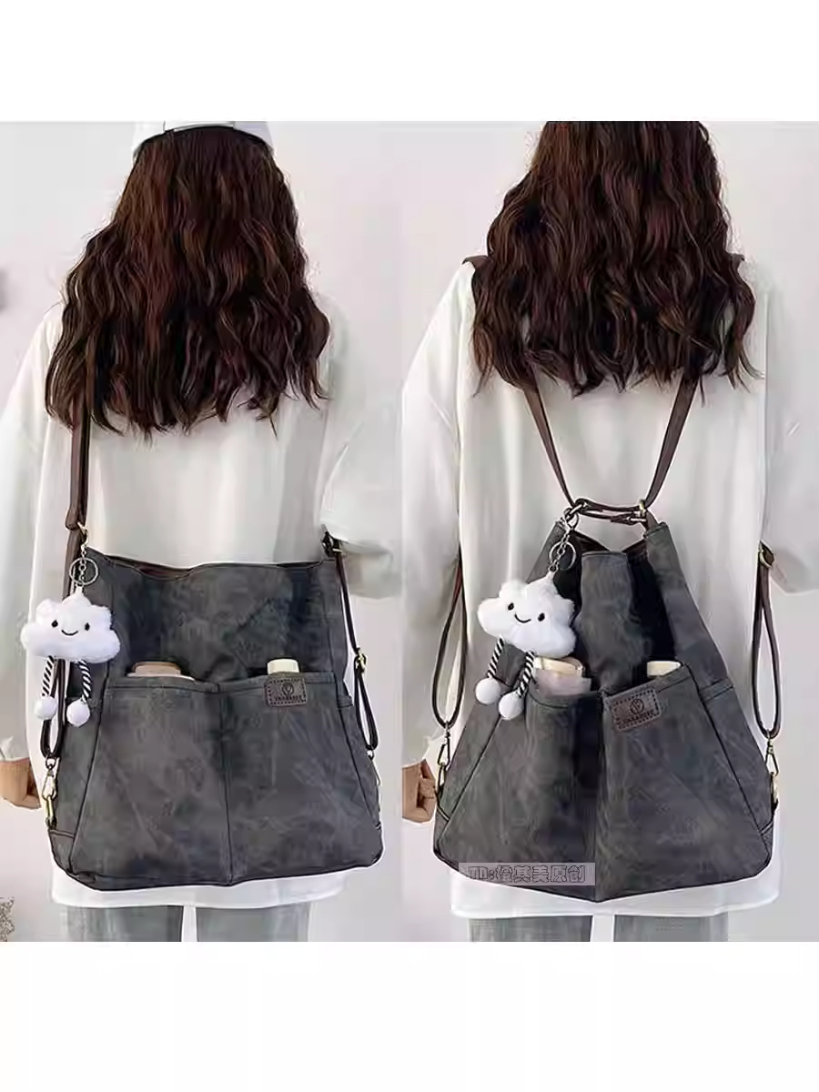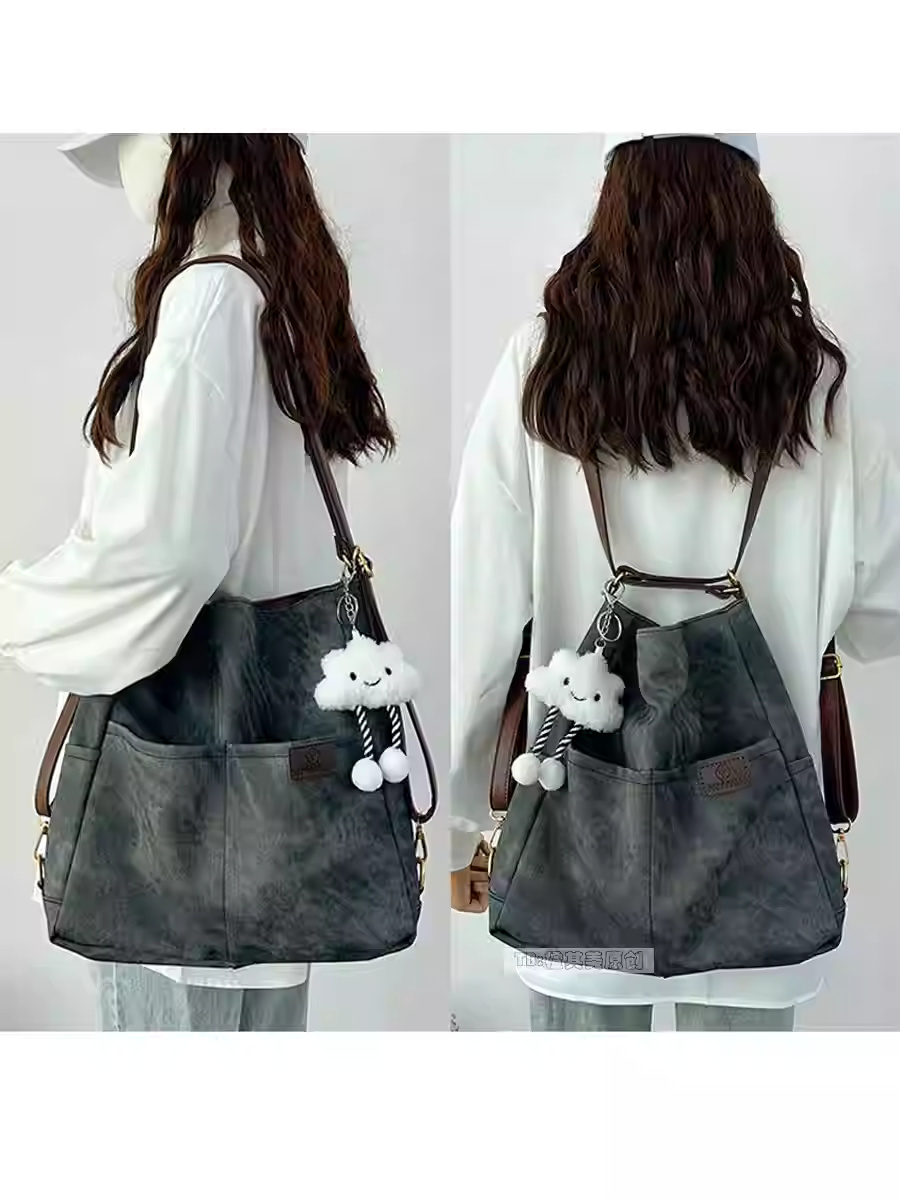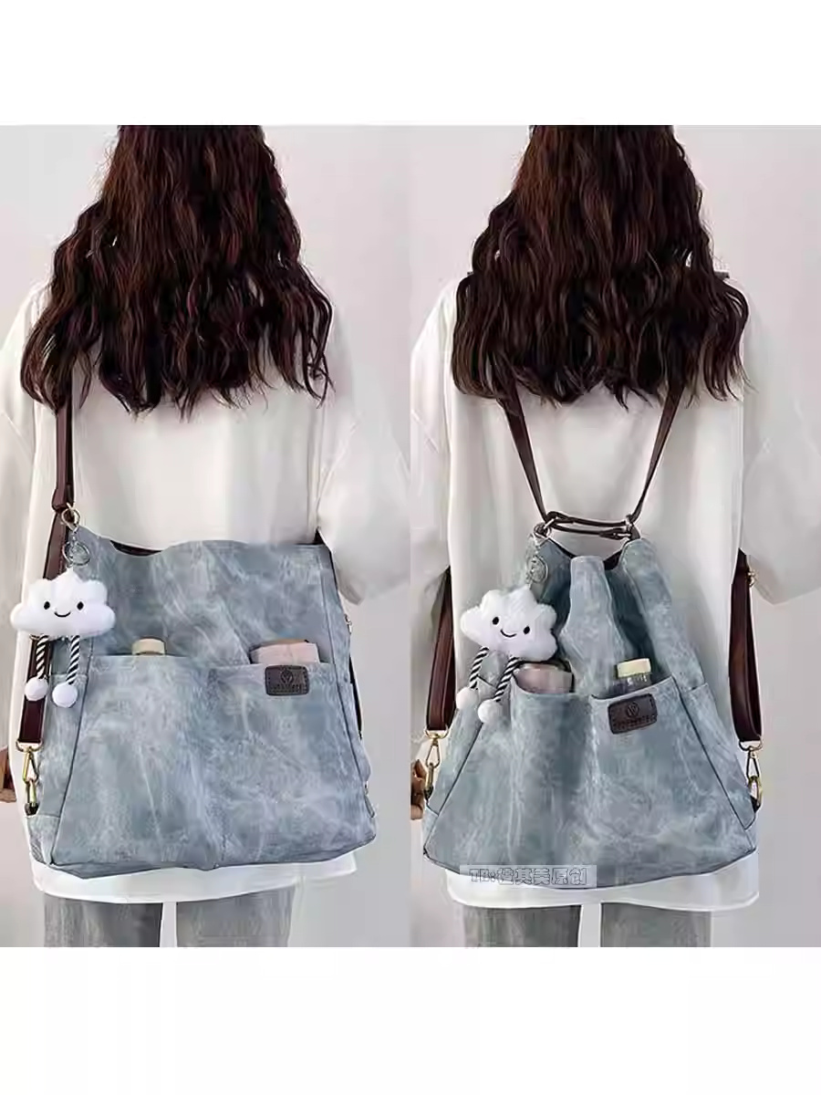 2025秋牛仔软皮三用背包包女大容量单肩托特包通勤斜挎包学生双肩