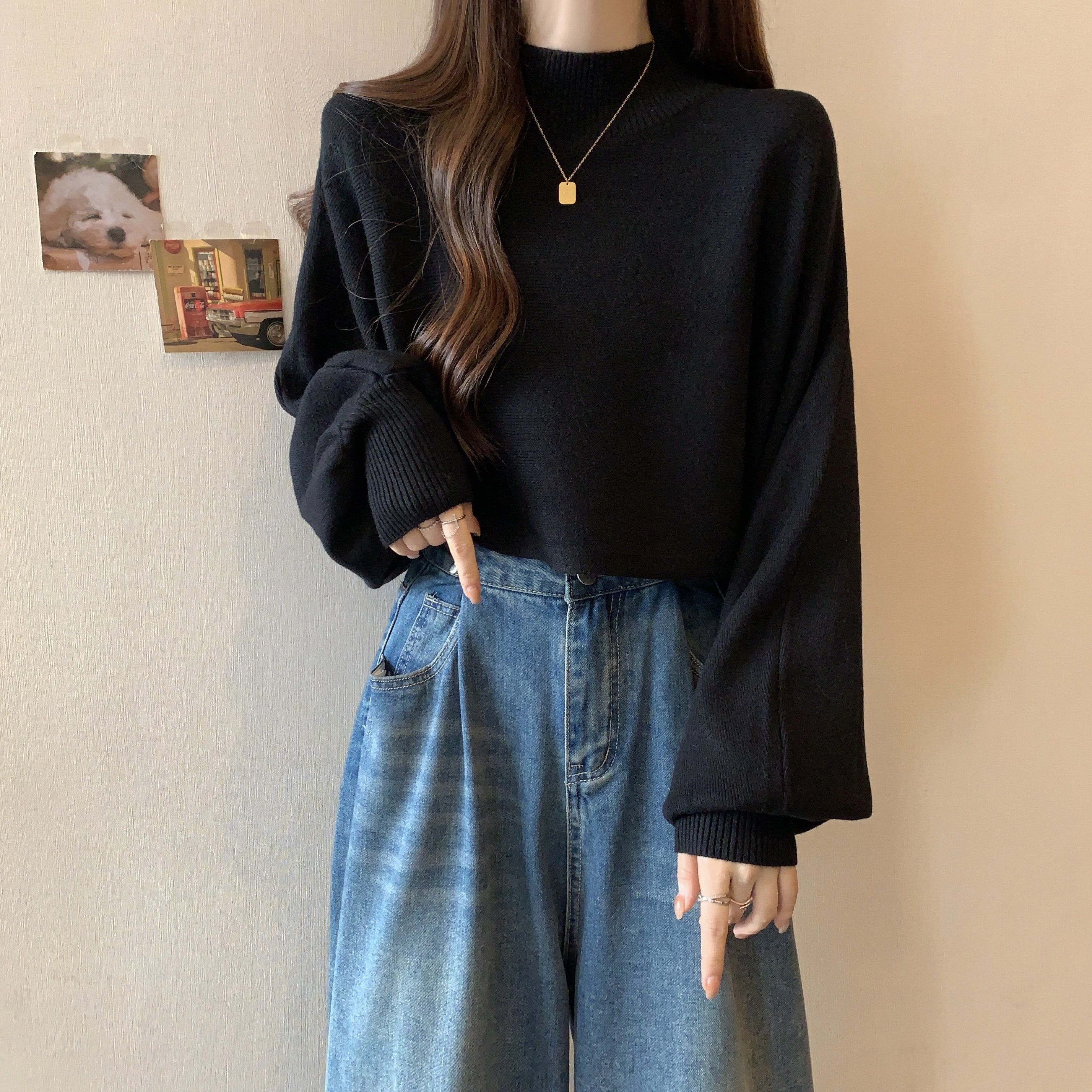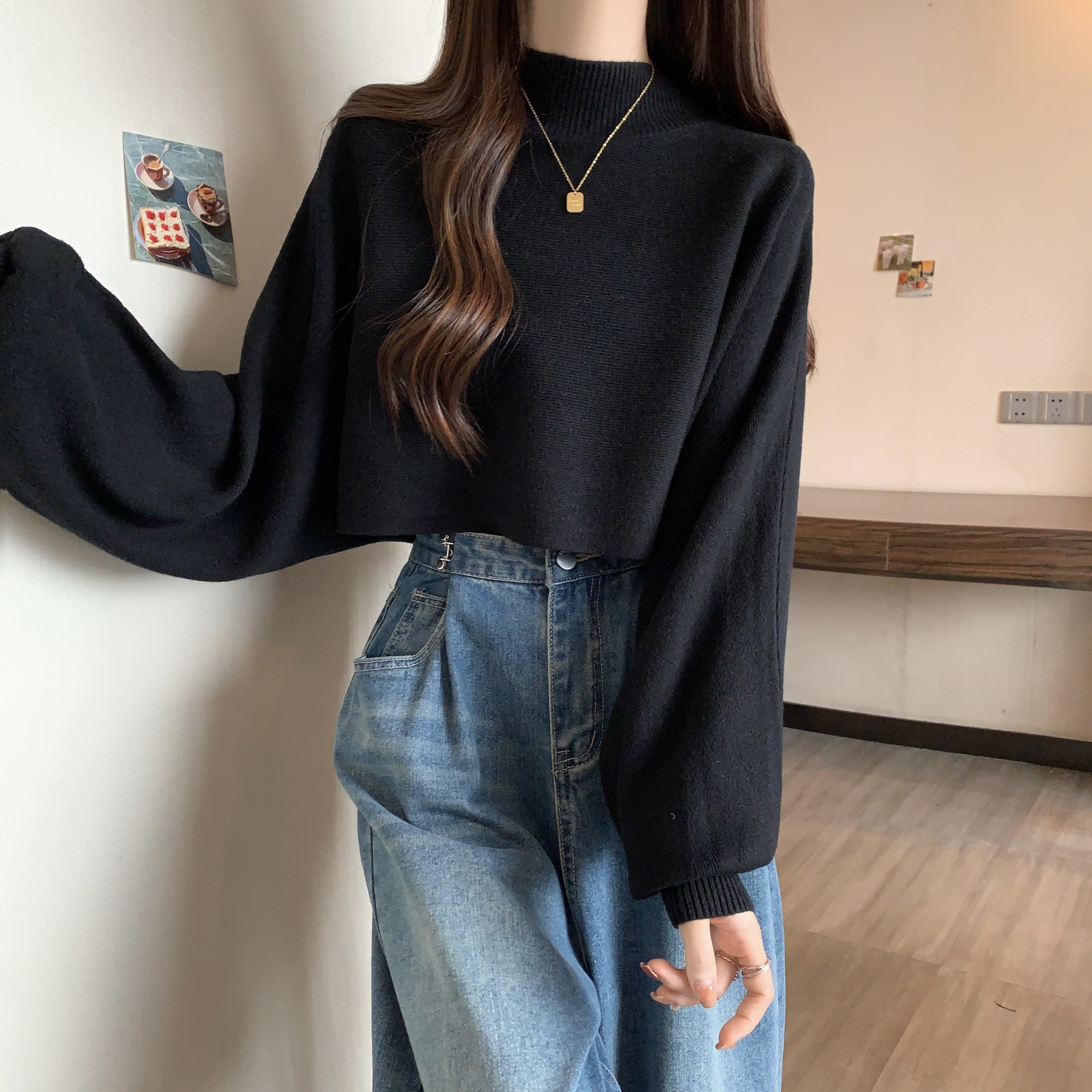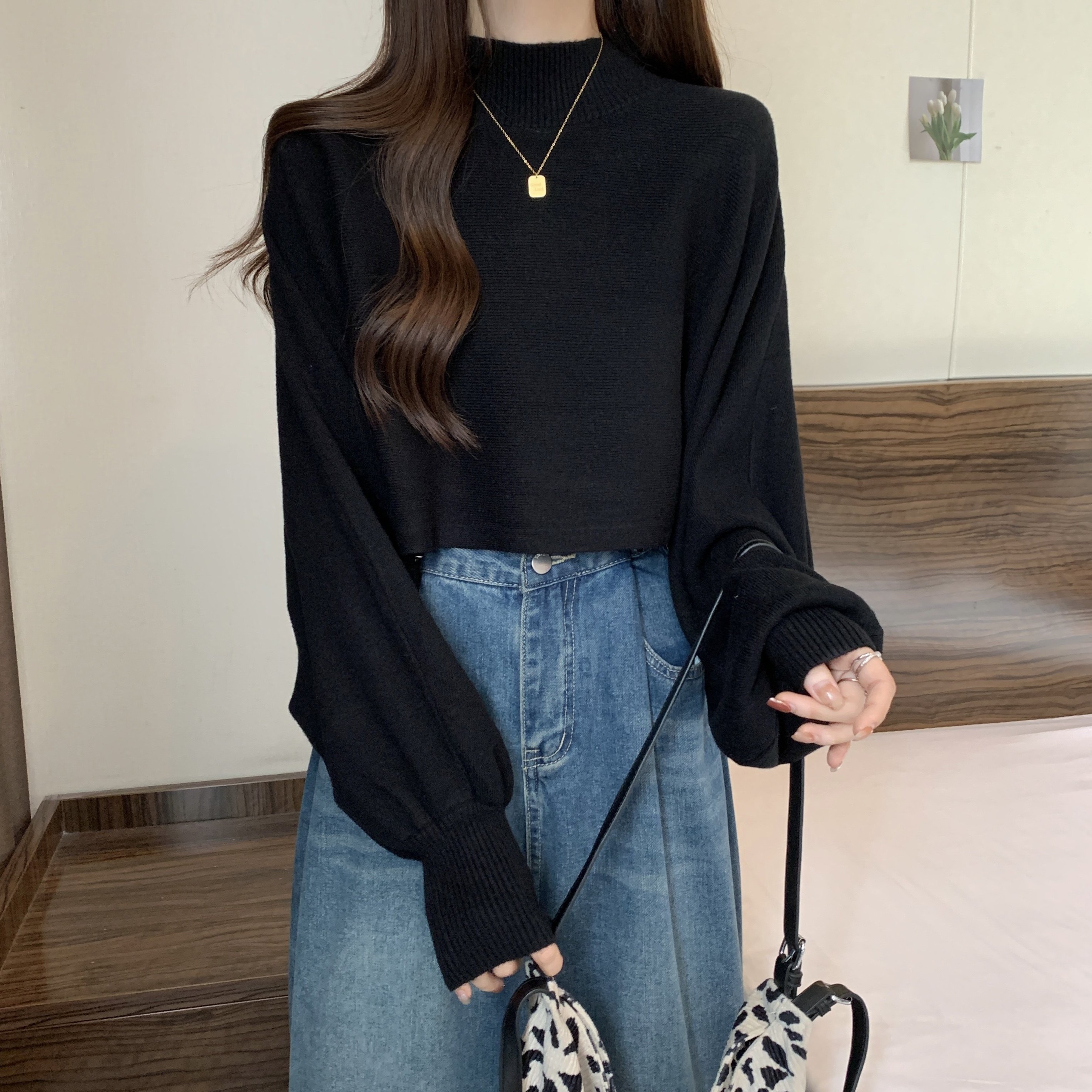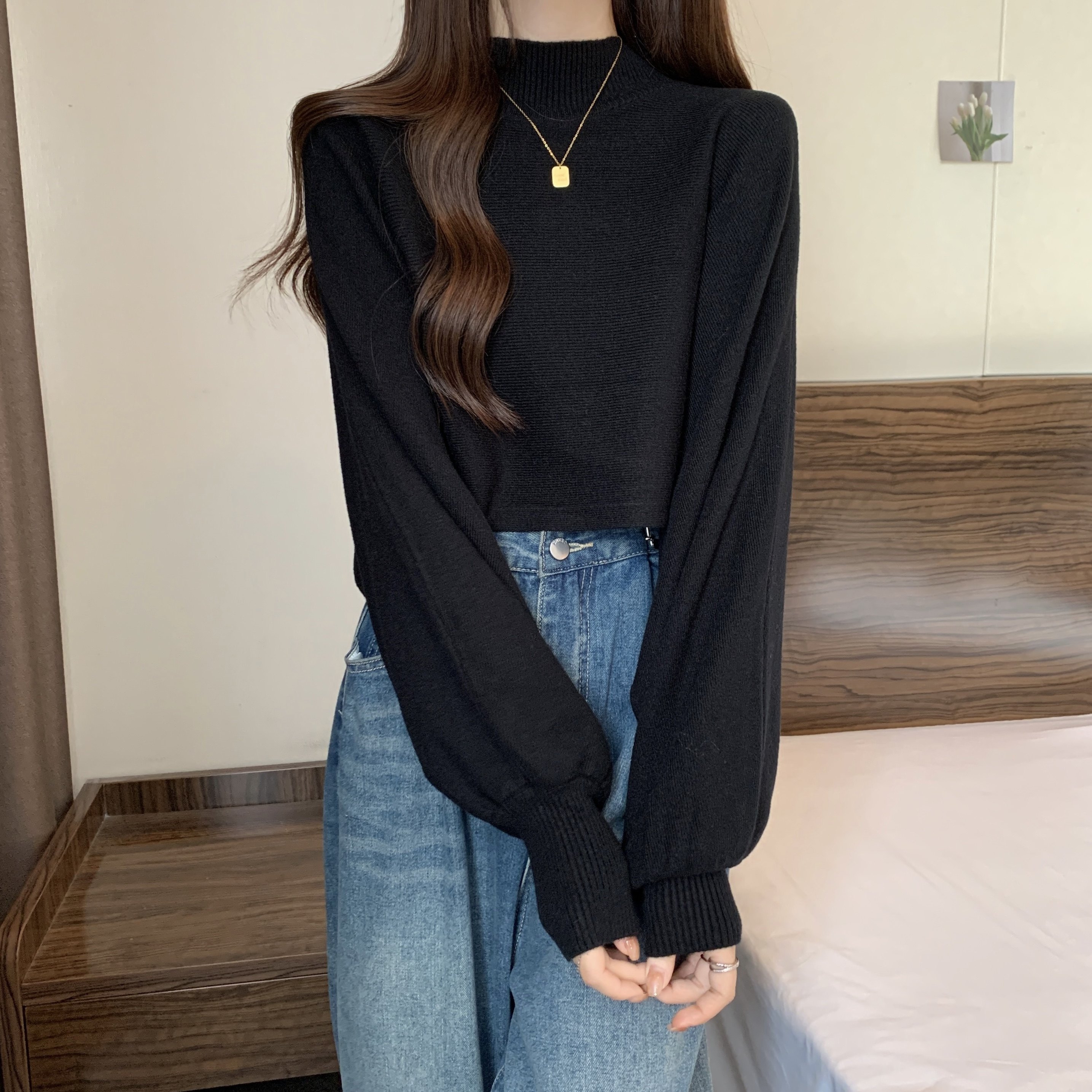 • 商品名称:半高领长袖针织打底衫女秋冬大码胖mm灯笼袖毛衣内搭宽松短款上衣