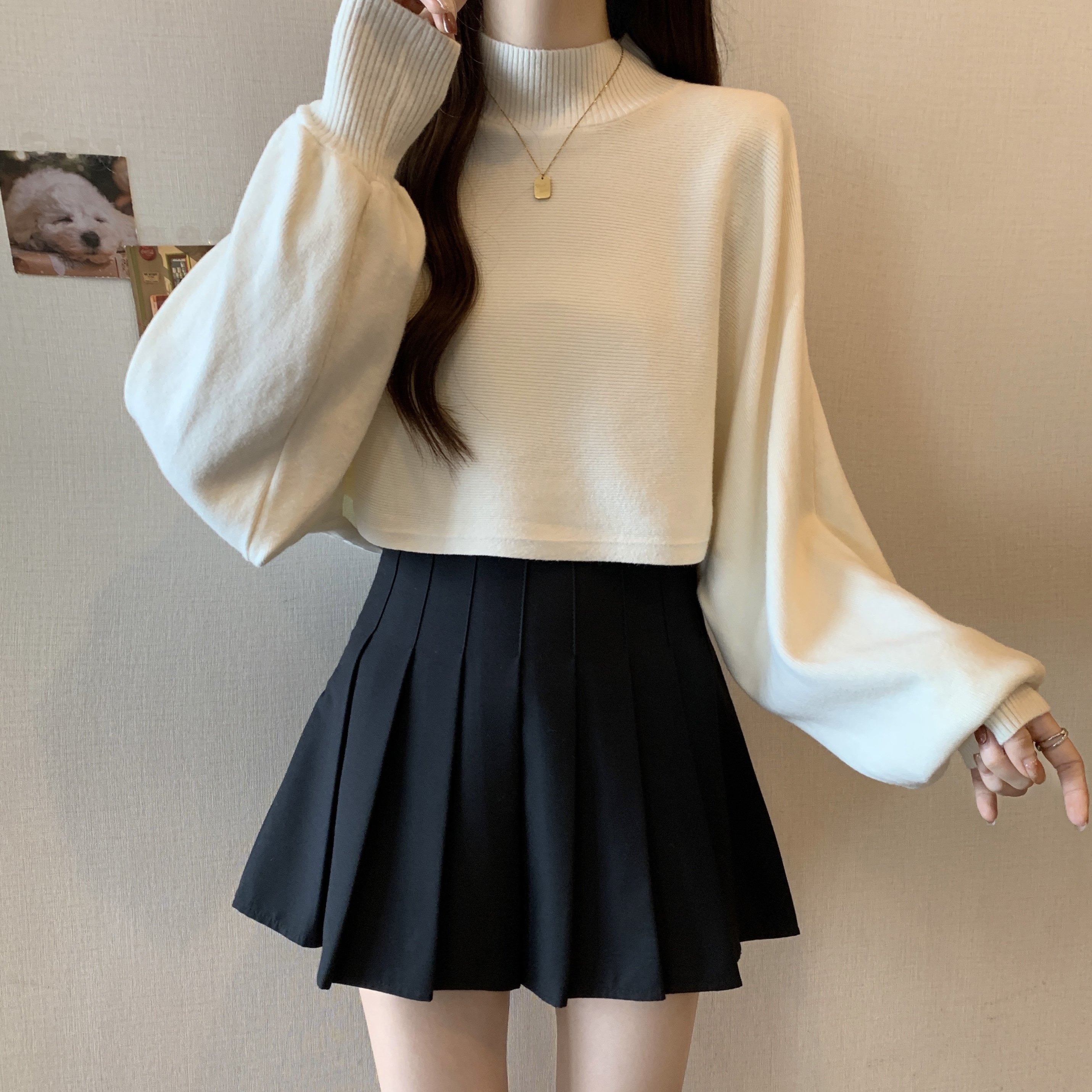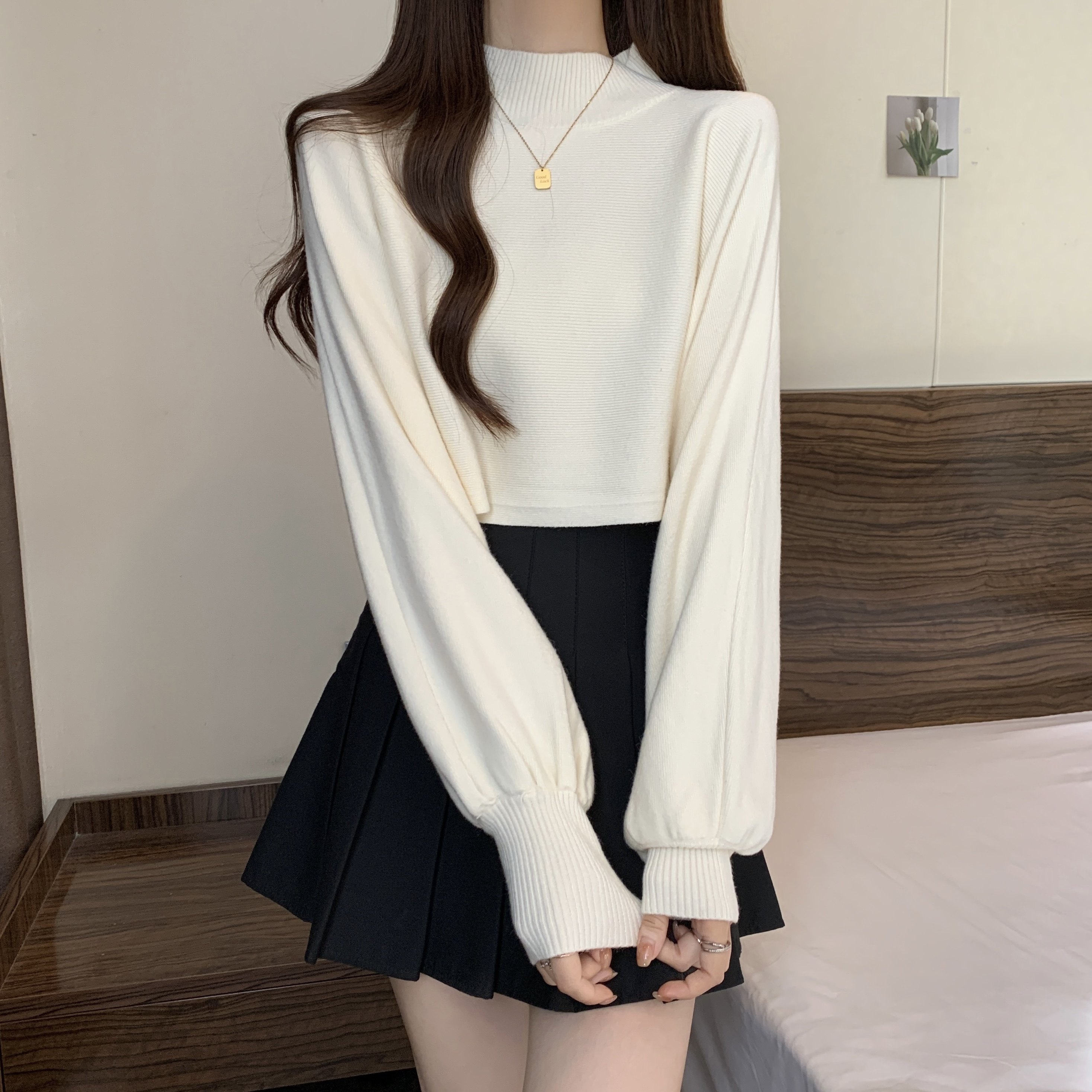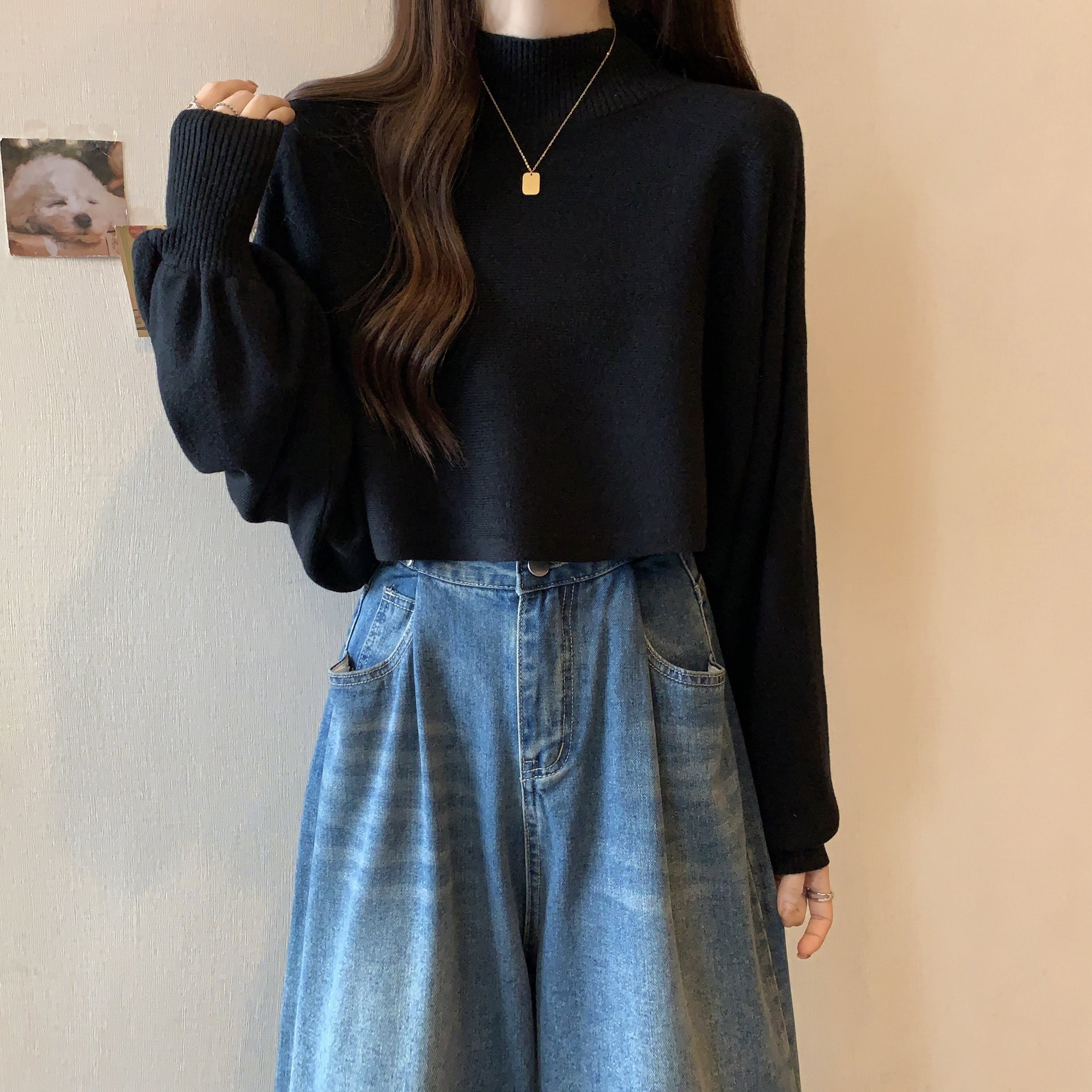 • 商品名称:半高领长袖针织打底衫女秋冬大码胖mm灯笼袖毛衣内搭宽松短款上衣