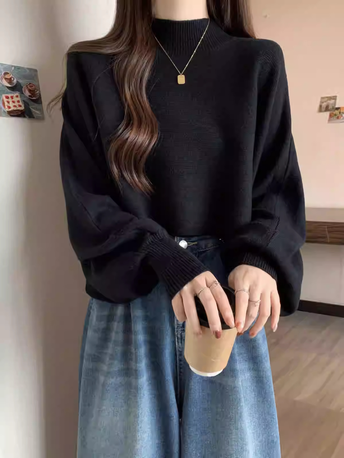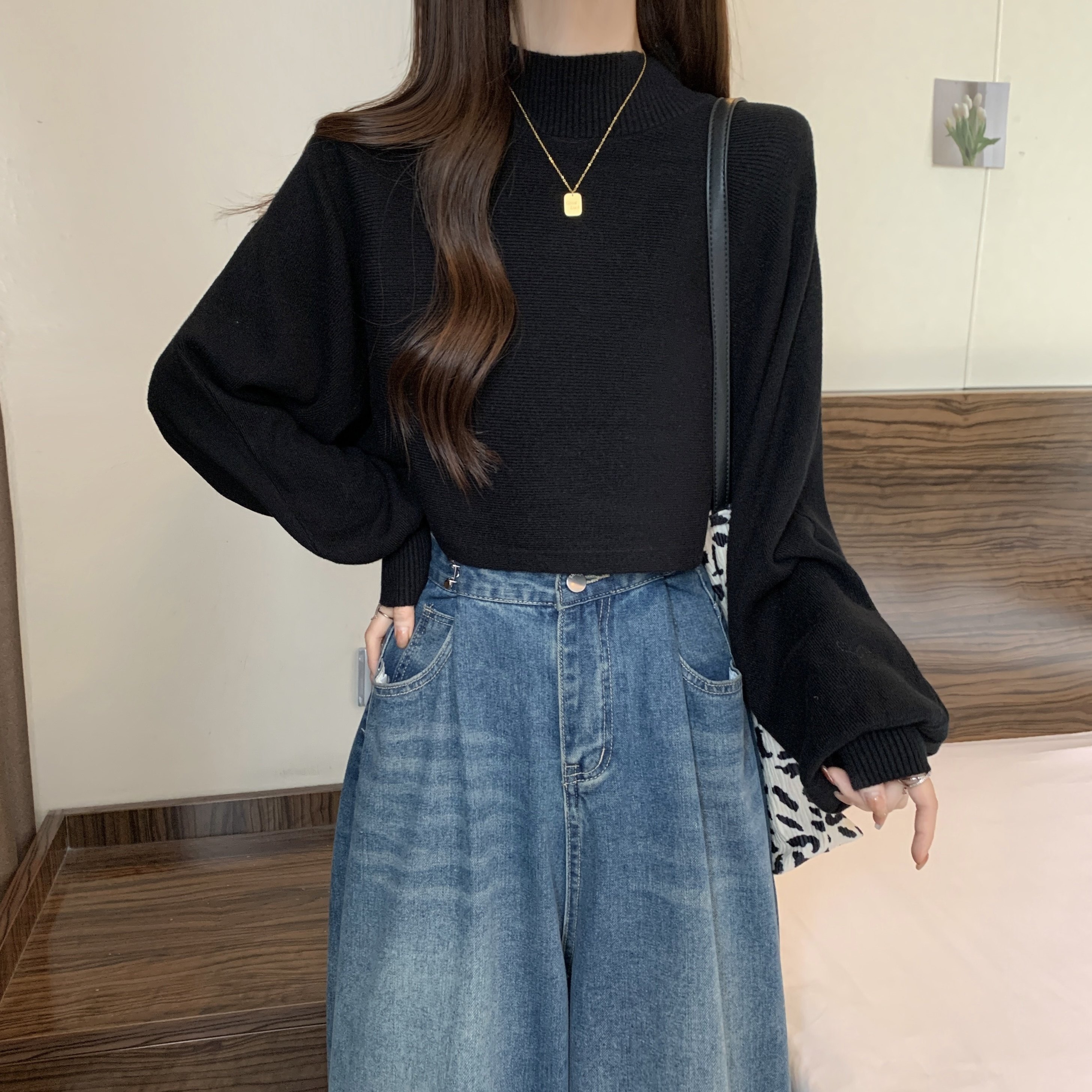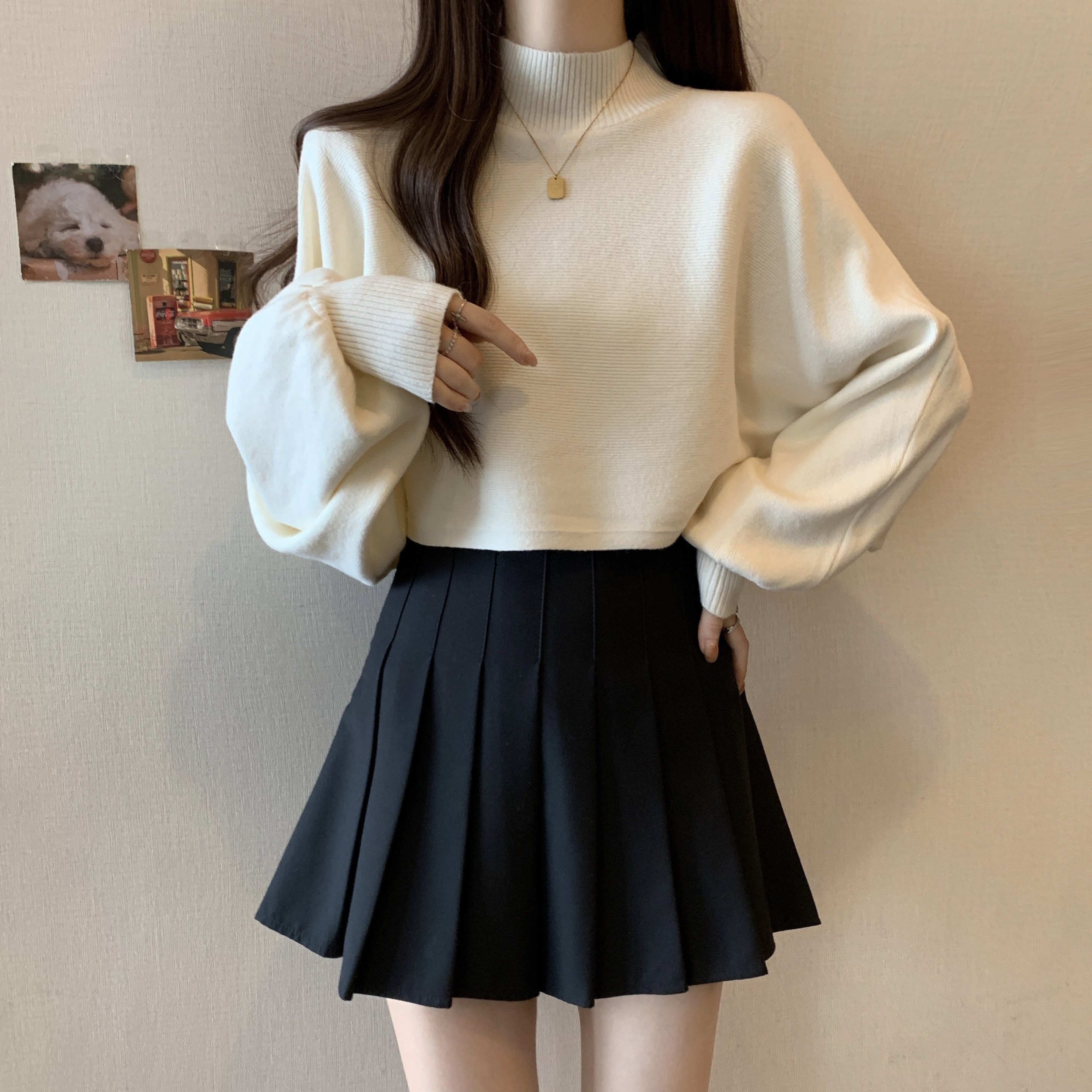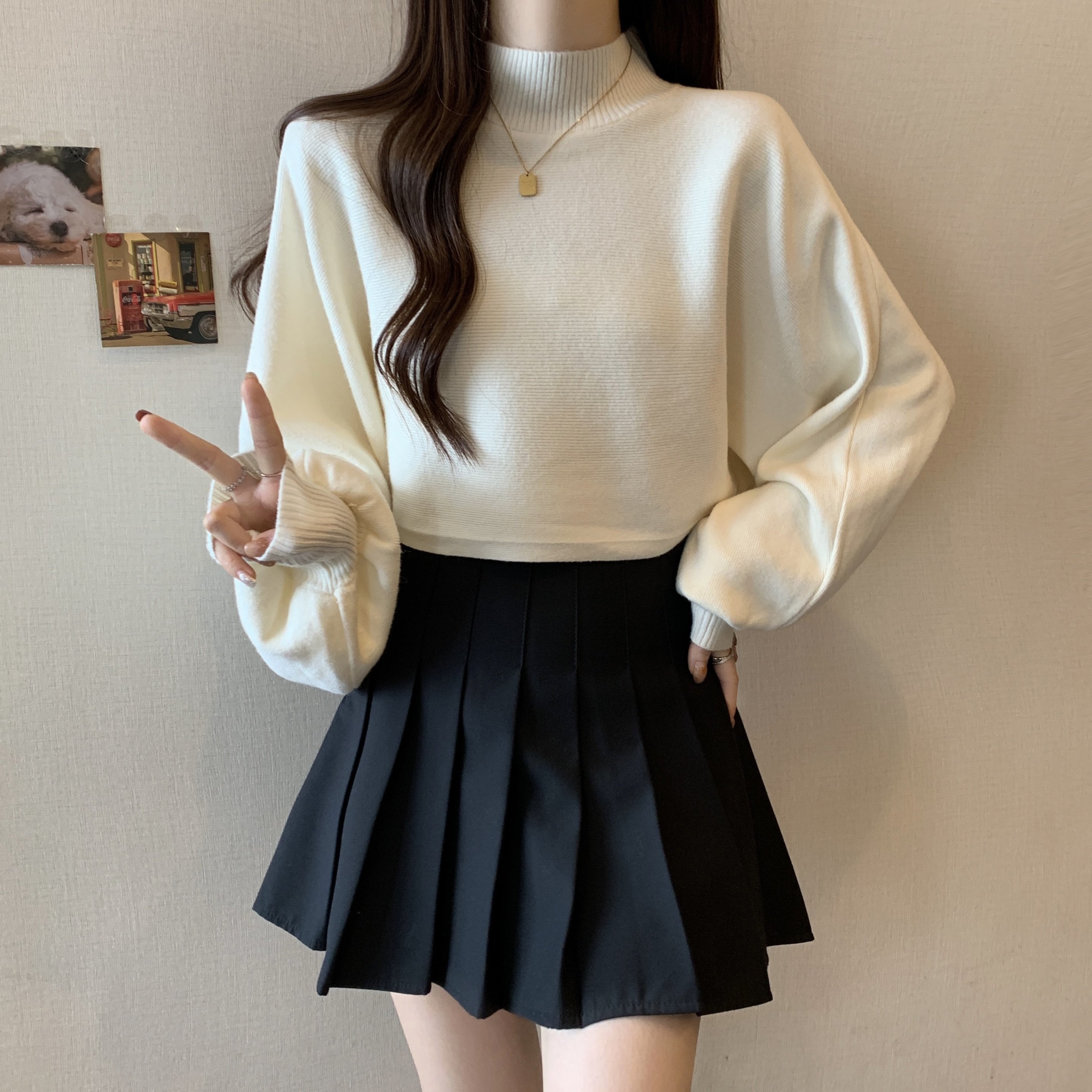 • 商品名称:半高领长袖针织打底衫女秋冬大码胖mm灯笼袖毛衣内搭宽松短款上衣