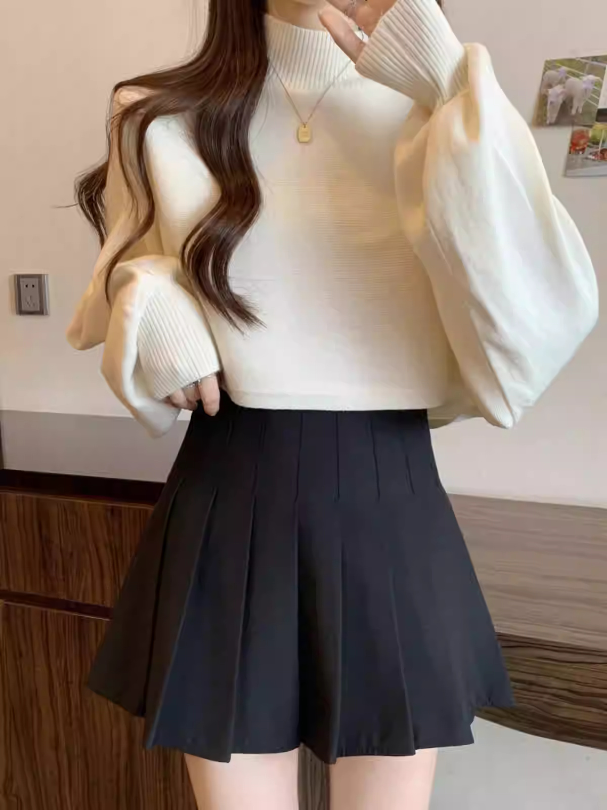 半高领长袖针织打底衫女秋冬大码胖mm灯笼袖毛衣内搭宽松短款上衣